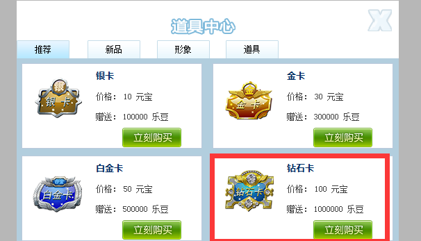 其次,游戏中充值100块钱,100块钱=100元宝,可以在道具中心兑换100万的乐豆,这就是我们的起始资金!