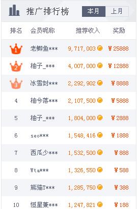总结:上图就是这个月的推荐排行榜,第一名奖励现金25888元哦,当然这些大神的成就并不是一蹴而就的,有技巧、有毅力地推广才能达到这样的成就,值得我们学习。