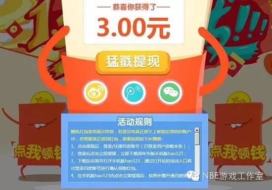 hao123导航大家都知道吧?“好123的活动,16周年送钱”。但也是出了漏洞,第一次差不多9号的时候,最低3块,最高7块。一般都是5元,用百度账号,秒体现。某宝1毛一个账号,一分钟可以操作一个号。不限制银行卡,无限提现,本人就买号刷,大牛用Fd一个号无限刷。最后活动黄了,过了两天,金额变小了,最大2元,限制银行卡。我已经不能玩了,大牛还在玩,依然一个号。FD无限撸。