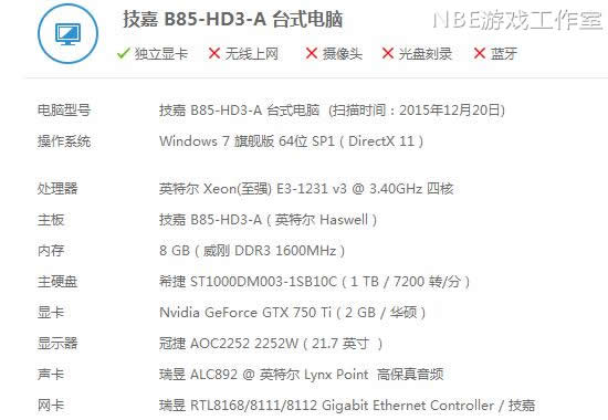 来看一下我的电脑配置(如下图)“E3-1231 v3搭配技嘉B85主板”。曾经也考虑过I5,但做游戏工作室要多开,长时间挂机,肯定偏向E3,就选择了它。板子有华硕与技嘉都不错,几年前装了一批技嘉的主板,很耐造,这次自然也就选择它了,必竟实战测试过,选择大板的理由很简单,我这人做任何事都留有余地!(万一将来需要32G内存呢?这个钱我认为不应该省)