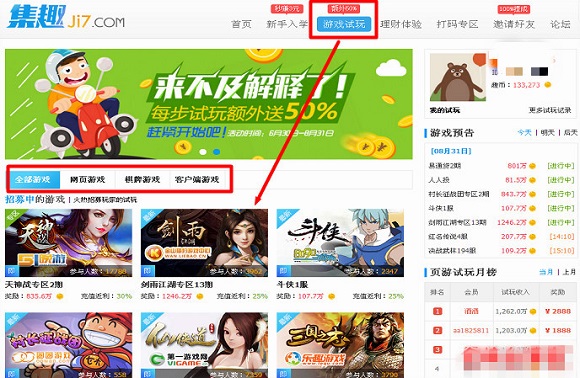 那么,集趣网上具体该怎么玩游戏赚人民币呢?很简单,你注册好后点击导航栏上的【游戏试玩】就能看所有能赚钱的游戏了,在集趣网上的几十款游戏你都可以进行试玩,选择你喜欢的游戏类型,完成游戏任务(一般都是提升等级,有的是累计游戏时长),然后领取人民币奖励。如果你时间和精力充裕,完全可以同时玩多款游戏,因为这样你赚到的钱才会更多!